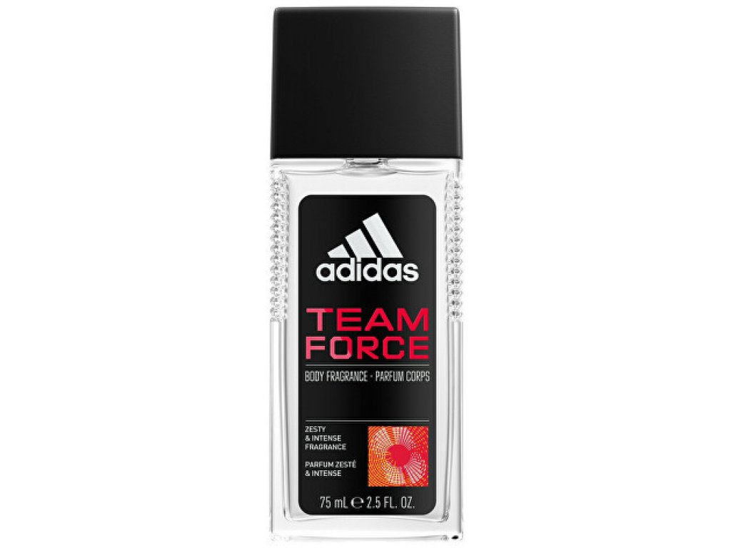 Adidas Team Force je moderná pánska vôňa, nabitá sviežosťou a energiou. Intenzívna citrusová vôňa, dlhotrvajúca sviežosť, bez hliníkových solí. Nezanecháva žiadne stopy na oblečení. Vegánske zloženie. Dermatologicky testované. Vrchné tóny vynikajú ovocnou arómou pomaranča, ananásu, mandarínky, grapefruitu a aldehydov. Stredné tony zjemňuje kolekcia borievky a jazmínu spolu s dráždivou vôňou santalového dreva. V základe je vôňa rafinovane dochutená jantárom, cédrovým drevom a tabakom.