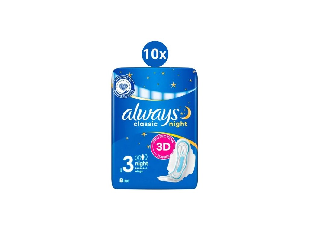 Hygienické vložky Always Classic Night sú navrhnuté na nočné použitie alebo pri silnejšej menštruácii, kedy poskytujú spoľahlivú ochranu a pocit čistoty. Vďaka špeciálnemu absorpčnému jadru rýchlo zachytávajú tekutinu a pomáhajú ju uzamknúť vo vnútri vložky, čím zvyšujú komfort počas spánku. Praktické krídelká pomáhajú vložku udržať na mieste a prispievajú k väčšej istote pri pohybe.