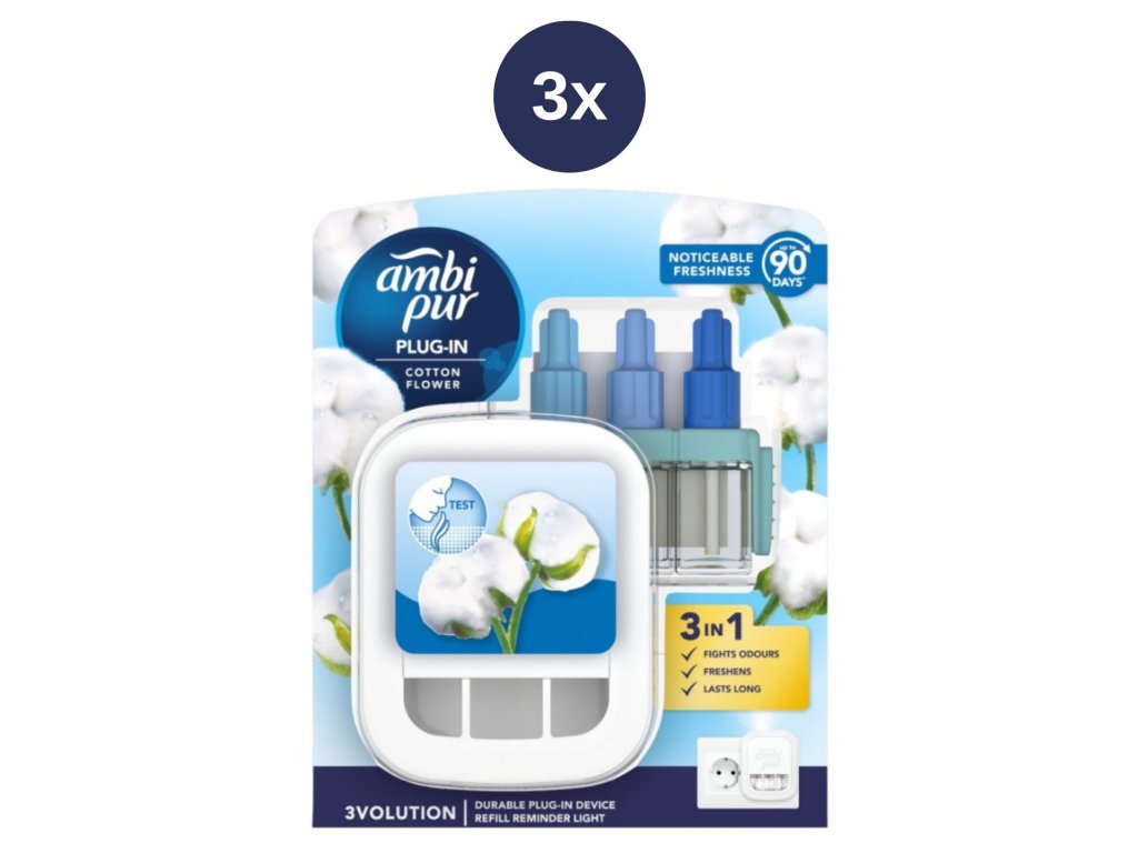 Vôňa inšpirovaná sviežosťou čistej bielej bavlny . Ambi Pur 3volution používa 3 rôzne parfémy harmonicky sa prelínajúce jeden v druhý . Vône sa samostatne spínajú každých 45 minút. Ambi Pur 3volution prichádza v troch lákavých variantoch štartérov aj náplní. Na strojčeku si môžete nastaviť intenzitu vône a diódy, ktoré sa postupne rozsvietia, indikuje ktorá z vôní je práve aktívna. Ambi Pur 3Volution, prvý osviežovač vzduchu, ktorý si budete užívať znova a znova a znova. Vydrží 90 dní pri 12-hodinovom dennom používaní a minimálnej intenzite vône.