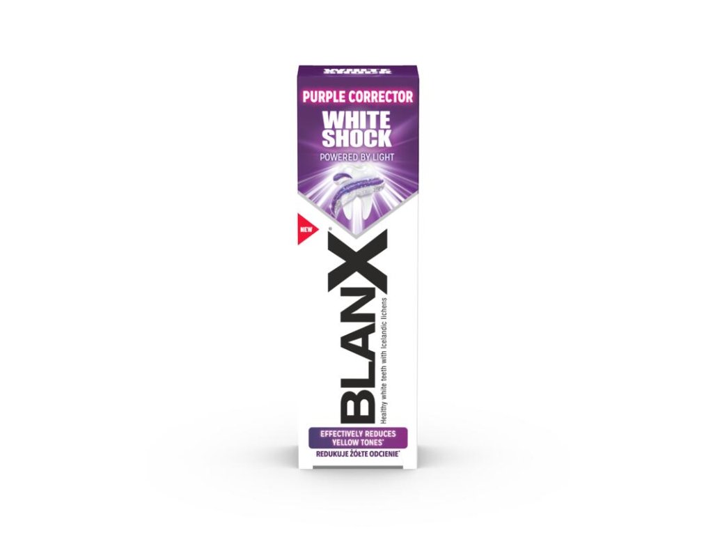 Bieliaca pasta s fialovým pigmentom pre okamžitý optický efekt BlanX White Shock Purple Corrector využíva patentovanú technológiu Actilux, ktorá sa aktivuje denným aj umelým svetlom a celý deň rozkladá molekuly spôsobujúce zafarbenie zubov. Špeciálny fialový pigment okamžite vyrovnáva žlté tóny, vďaka čomu pôsobí úsmev belší už po prvom použití. Klinické testy preukazujú, že pravidelným používaním 2× denne je možné dosiahnuť viditeľné zosvetlenie odtieňa už po 6 dňoch. Pre ešte intenzívnejšie výsledky kombinujte s BlanX White Shock Purple Treatment + LED. Vlastnosti: okamžité optické zosvetlenie vďaka fialovej korekcii dlhodobý účinok technológie Actilux aktivovanej svetlom klinicky potvrdený účinok už po 6 dňoch* extra sviežu chuť a čistý pocit po každom čistení Použitie: Čistite zuby 2× denne po dobu 2 minút. Len pre dospelých. Upozornenie: Dočasné ľahké sfarbenie jazyka alebo slizníc je prirodzeným efektom zloženia a mizne po vypláchnutí. Obsahuje: Sodium Fluoride 0.32% (1450 ppm F⁻).Dodatočné parametre