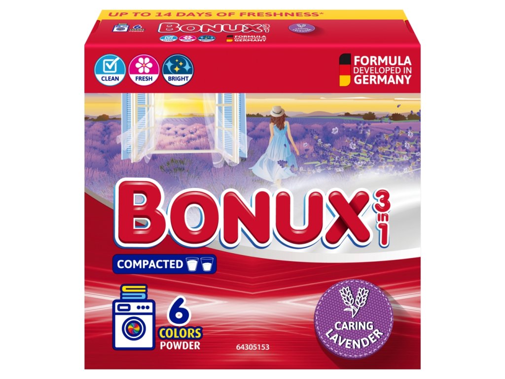 Bonux Color Caring na farebnú bielizeň s vôňou levandule a jej zloženie 3v1 vám pri náročnom praní pre celú rodinu pomôže. Dodáva vašej bielizni dlhotrvajúcu sviežosť. Nie je vhodný pre vlnu. Skvele odstraňuje škvrny, prepožičiava bielizni sviežosť a nie je drahý. Inteligentné zloženie s tromi výhodami v jednom balení od Bonuxu! A celá rodina môže byť spokojná!