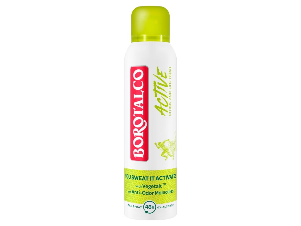 Borotalco deodorant sprej Active s vôňou citrusov vďaka účinnému zloženiu vstrebáva pot a zanecháva pokožku podpazušia suchú a chránenú po celých 48 hodín. Efektivita bola testovaná aj pri vysokom fyzickom namáhaní. Vôňa Citrus: Šumivé tóny dávajúce cestu k srdcu citrusových plodov v modernej revízii pôvodnej vône Borotalco.