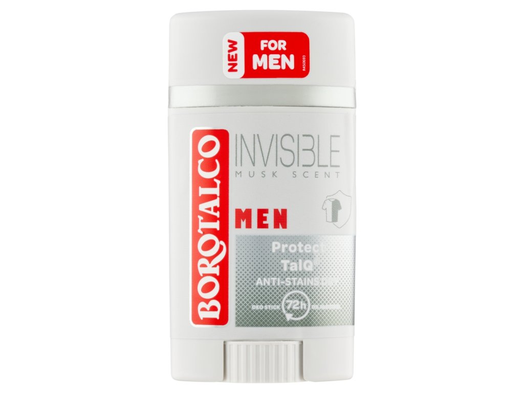 Doprajte si nový zážitok s Borotalco tuhým dezodorantom Invisible s Protect TalQ©. Pre mužov, ktorí hľadajú špecifickú ochranu proti potu a škvrnám! Exkluzívne ochranné zloženie, ktoré kombinuje suchú ochranu práškového mastenca a sieť neviditeľných molekúl, ktorá zachytáva a neprenáša stopy, pachy a škvrny. Na ochranu proti škvrnám na oblečení a extra suchý pocit na pokožke. 72hodinová účinnosť. Obsahuje 0% alkoholu. Dermatologicky testované. Pižmová vôňa: Podmanivá textúra Fougère na báze pižma, ktorá zdôrazňuje dlhotrvajúcu vôňu jantárového dreva so sviežimi aromatickými tónmi. POUŽITIE: Aplikujte do podpazušia. Neaplikujte na poranenú alebo podráždenú pokožku. Otáčajte kolieskom až sa objaví výrobok. ZLOŽENIE: viď Ingredients. UPOZORNENIE: Uchovávajte mimo dosahu detí. Nepoužívajte na podráždenú alebo poškodenú pokožku. Pokiaľ sa objavia príznaky podráždenia alebo alergie ihneď prestaňte výrobok používať.ŽIVOTNÉ PROSTREDIE: Úplne prázdny a čistý plastový obal je možné recyklovať. Chráňte životné prostredie triedením odpadu. Má to zmysel!