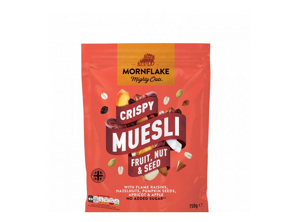 Chrumkavé Müsli Fruit, Nut & Seed je lahodná zmes celozrnných obilných vločiek, veľkých kúskov ovocia a pražených orieškov pre ten najsenzačnejší zážitok z raňajok. V zmesi nájdete hojné množstvo dvoch typov sušených hrozienok, datlí, marhúľ, jabĺk, ale aj mandle a lieskové oriešky, či tekvicové a slnečnicové semienka. Pre zvýraznenie špeciálnej chuti raňajkovej zmesi k nej bol pridaný aj opečený kokos, čo müsli dodalo jemnú a príjemnú arómu. Je zdrojom komplexných sacharidov a vlákniny, avšak vyznačuje sa nulovým prídavkom soli či cukru.