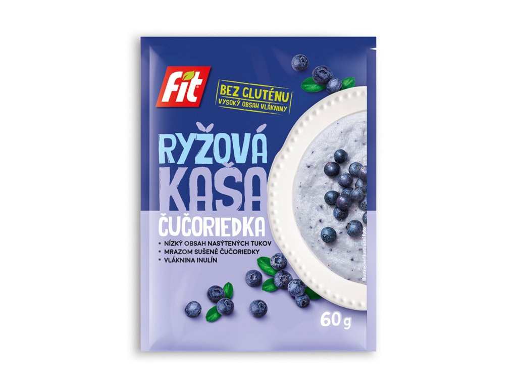 Sypká zmes z obilnín na prípravu ryžovej kaše s kúskami mrazom sušených čučoriedok, S vysokým obsahom vlákniny