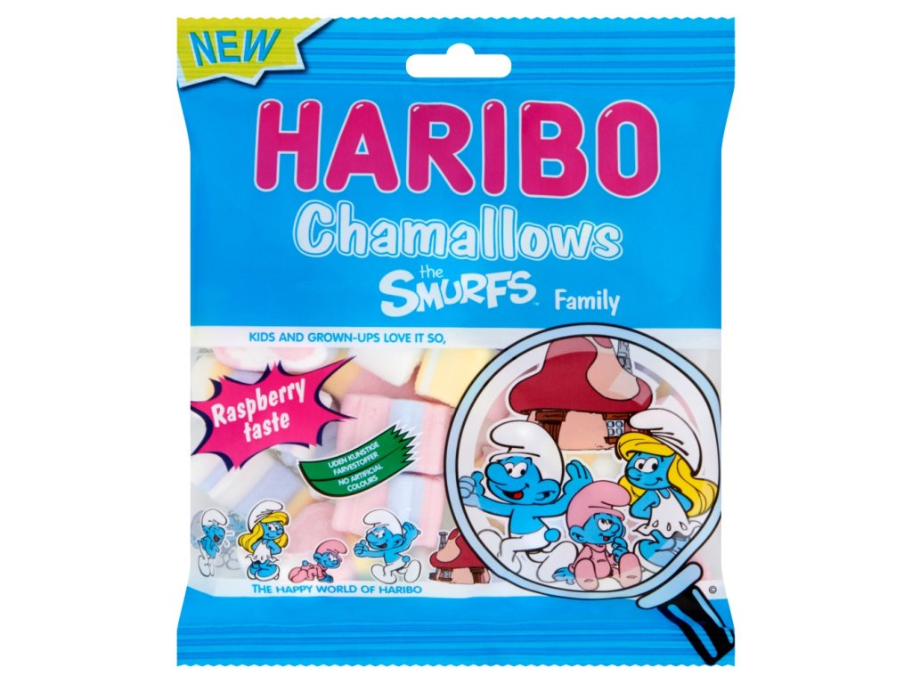Penové cukrovinky s lahodnou vanilkovou a malinovou príchuťou v tvare obľúbených šmolkov postavičiek!