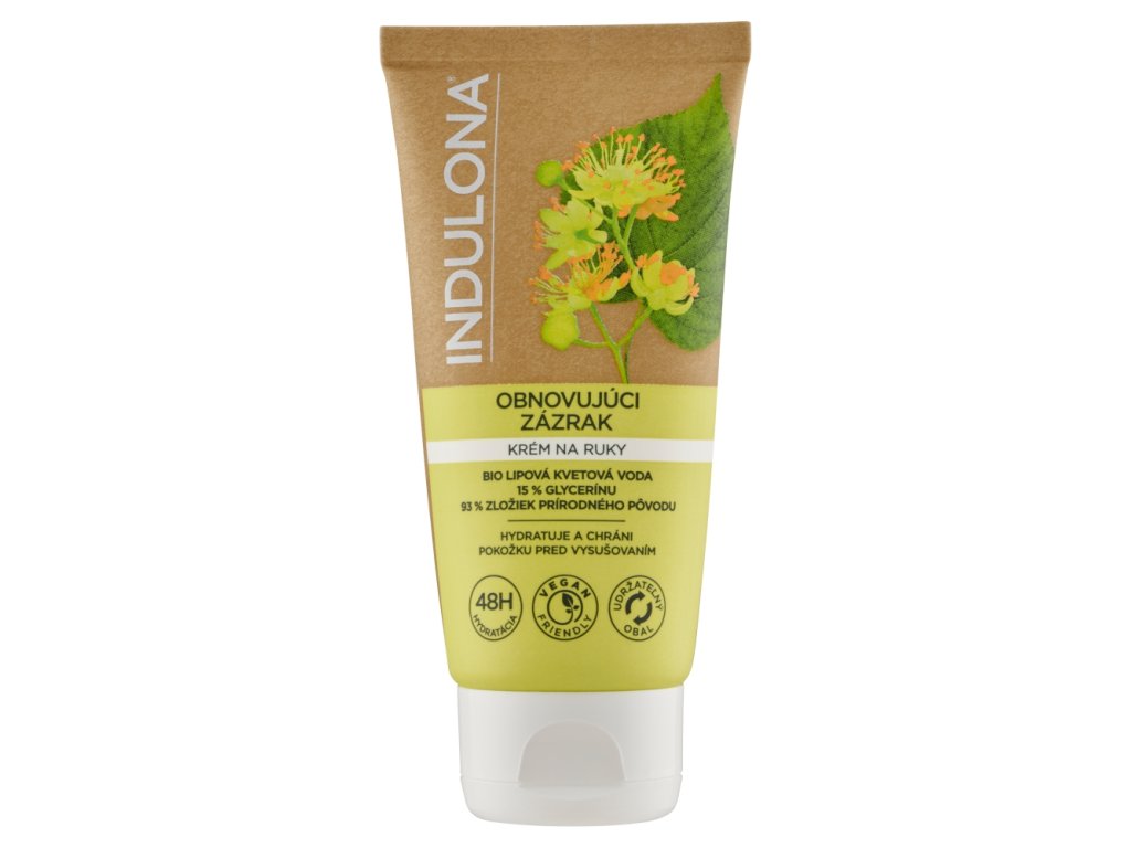 Krém na ruky Indulona Obnovujúci zázrak bol špeciálne vyvinutý tak, aby efektívne hydratoval pokožku, chránil ju pred vysušovaním a posilňoval ju pred vonkajšími vplyvmi. Uzamyká v pokožke vlhkosť a poskytuje jej dlhotrvajúcu ochranu. Obsahuje bio lipovú kvetovú vodu, známu svojimi vysoko hydratačnými a antioxidačnými vlastnosťami, 15% glycerínu a 93% zložiek prírodného pôvodu. Vhodný na každodenné použitie. Okamžitá hydratácia pokožky je zvýšená o 40% **. Ruky sú jemnejšie a hladšie už po 1 použití**. Ruky vyzerajú mladistvejšie; 84 %*.