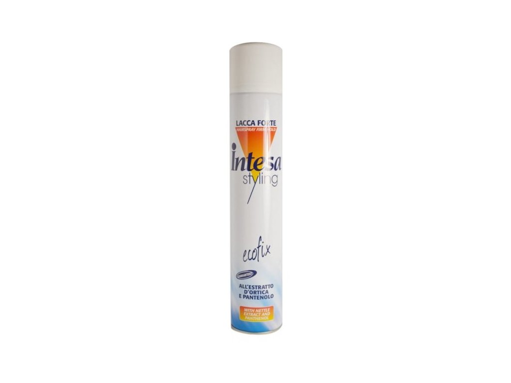Intesa Styling Hair Spray Forte silne tužiaci lak na vlasy s výťažkom zo žihľavy as panthenolom. Tento kadernícky lak na vlasy má špeciálne zloženie vynájdené na prirodzenú fixáciu akéhokoľvek typu účesu, ktorému zaručí prirodzený tvar a trvanlivosť, vďaka výťažku zo žihľavy a panthenolu, ktoré sú základnými produktmi v starostlivosti o vlasové vlákno . Rešpektuje prirodzenosť vlasov bez toho, aby ich vysušil zanecháva vlasy hodvábne a lesklé. Znižuje mastenie vlasov. Ľahko vyčesateľný hrebeňom .