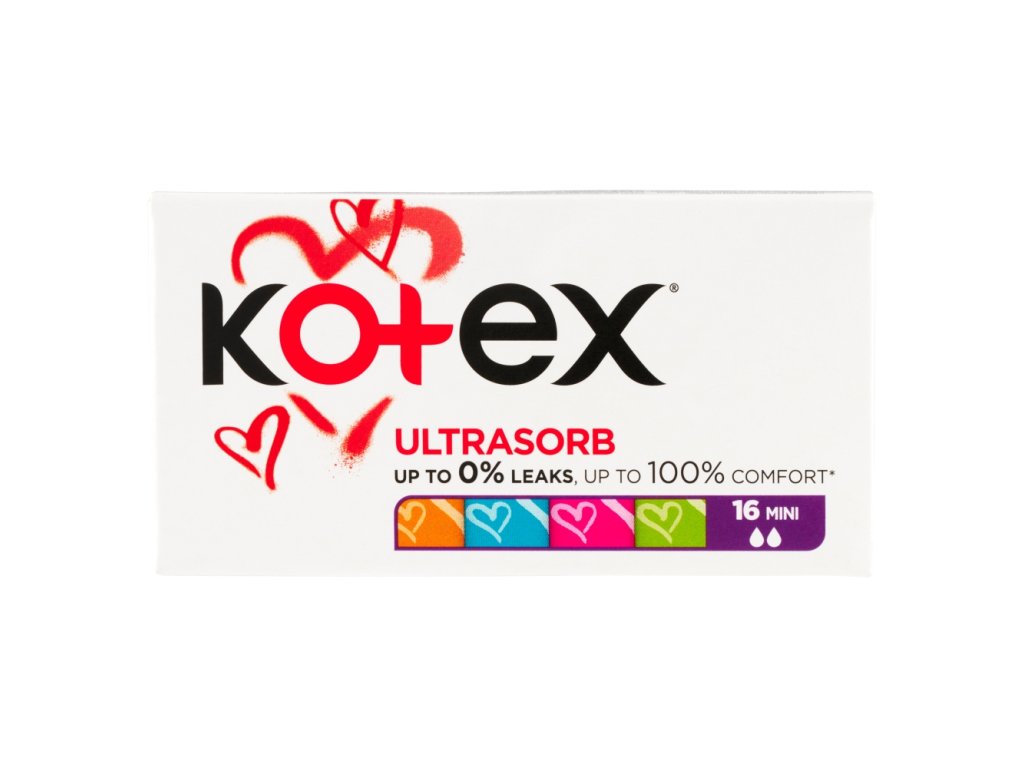Tampóny Kotex Ultrasorb majú špeciálne navrhnuté modré absorpčné jadro, vyrobené z vysoko absorpčných vlákien, ktoré zabránia pretečeniu. Hladký hodvábny povrch a zaoblenú špičku pre ľahšie zavádzanie. Unikátny " Twist&open " systém pre ľahké rozbaľovanie tampónu. Jednotlivé Tampóny balené do štýlových pastelových farieb vyjadrujúcich sebavedomie aj v období periódy. Variant UltraSorb Mini sú ideálne Tampóny pre obdobie, kedy dievčatá s Tampóny začínajú. Alebo pre veľmi slabú menštruáciu.