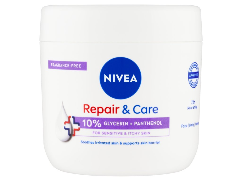 Nivea telový krém 400 ml Repair & Care pre suchú pokožku je multifunkčným krémom, do hĺbky hydratuje a zjemňuje suchú a hrubú pokožku. Zloženie obsahuje 12% glycerínu a Vitamín E. Regeneračná a extra hydratačná starostlivosť pre pokožku celého tela. Nenarušuje prirodzenú kožnú bariéru pokožky. Vhodné na každodenné použitie. Dermatologicky testované.