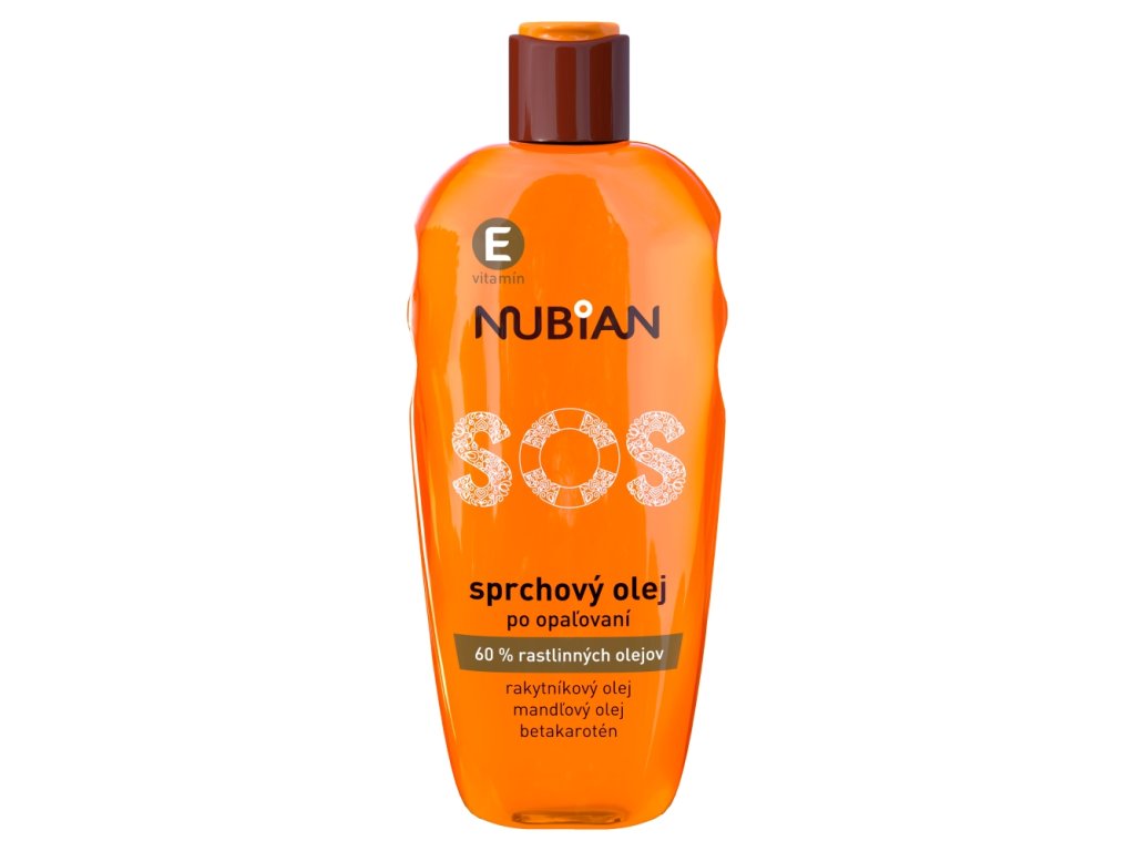 Regenerovať pokožku po náročnom dni strávenom na slnku môžete teraz aj v sprche. Nubian SOS sprchový olej po opaľovaní obsahuje až 60% rastlinných olejov, ktoré zregenerujú prípadné poškodenia pokožky spôsobené spálením a vrátia jej stratenú hydratáciu. Rakytníkový olej, mandľový olej a vitamín E pôsobia ochranne a regeneračne, zatiaľ čo slnečnicový a ricínový olej majú na pokožku zvláčňujúci účinok. Udržanie prirodzeného a rovnomerného opálenia zaistí betakarotén. Naneste na vlhkú pokožku, jemne umyte telo a opláchnite. Sprchový olej šetrne umýva podráždenú, citlivú a suchú pokožku. Je vhodný na každodenné použitie. Pravidelným používaním pokožka získa potrebnú hydratáciu a regeneráciu.