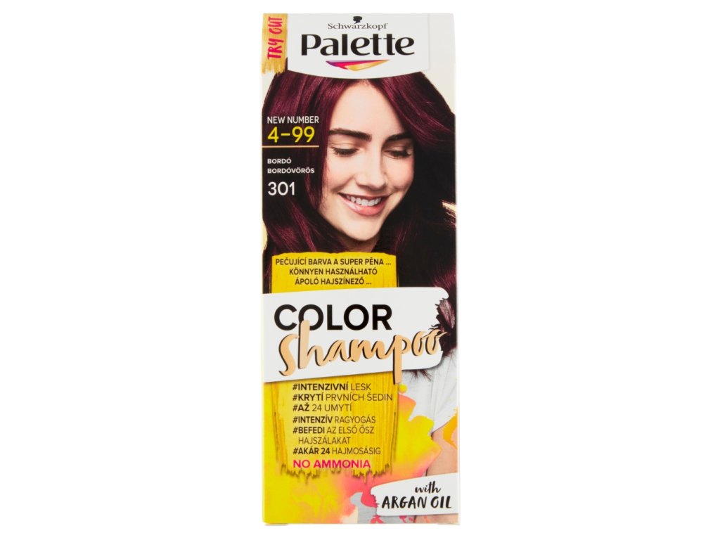 Špeciálna receptúra bez amoniaku obohatená o arganový olej sa stará o Vaše vlasy už počas farbenia od korienkov až ku končekom. Jedinečné spojenie farbiaceho krému a vyvíjača s nízkou koncentráciou, okrem odtieňov 320, 315, 321, 308, 317, (3 %) umožňuje, aby Palette Color Shampoo bol oveľa šetrnejší v porovnaní s ostatnými viac koncentrovanými vyvíjačmi, (6 % a viac). Rovnako špeciálne farebné pigmenty obsiahnuté v receptúre dodajú Vašim vlasom excelentný farebný výsledok. Výsledok prirodzene výrazné, zdravo vyzerajúce vlasy s posilneným leskom.