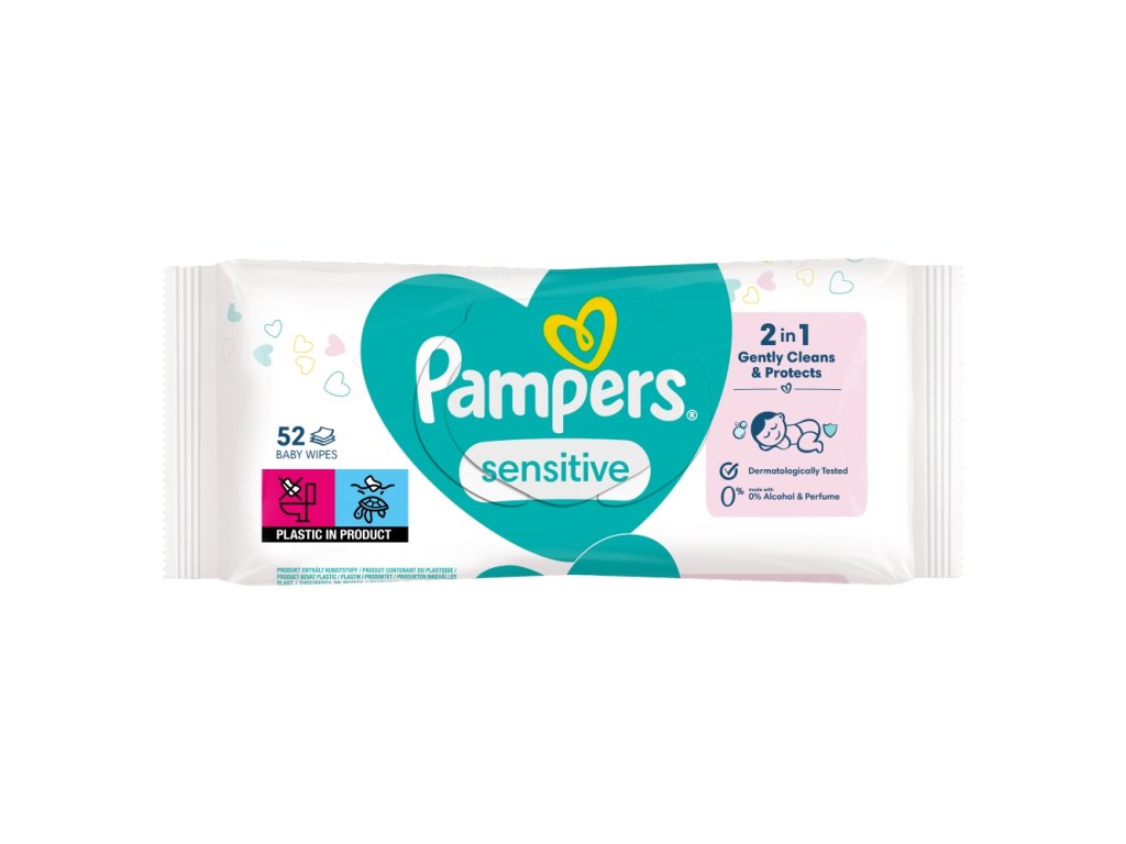 Pampers vlhčené obrúsky Sensitive je šetrnejší variant ako čistenie pomocou žinky a vody. Vďaka svojmu zloženiu pomáhajú predchádzať podráždeniu pokožky pomocou udržiavaním prirodzenej hodnoty jej pH. Neobsahujú parfémy ani alkohol . Sú dermatologicky testované a sú vhodné na používanie od prvého dňa.