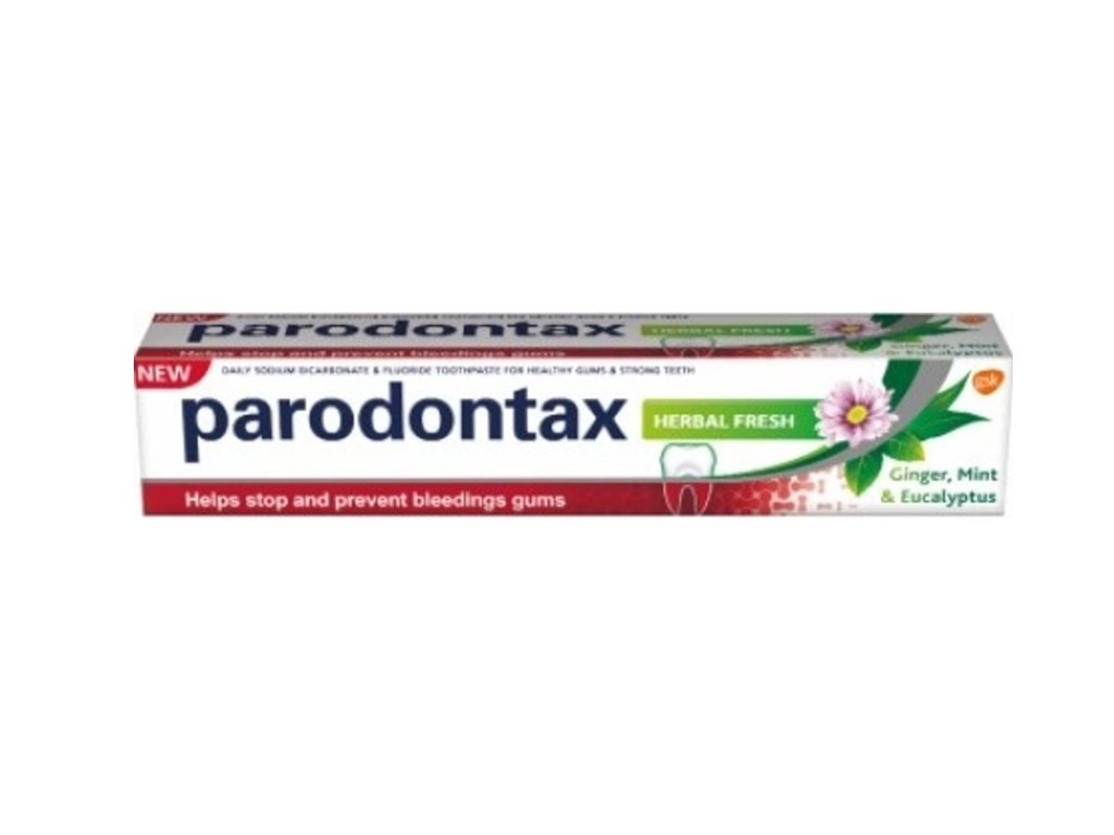 Parodontax Herbal Fresh je zubná pasta určená na každodennú starostlivosť o zuby a ďasná, ktorá pomáha zastaviť a predchádzať krvácaniu ďasien – jednému z prvých príznakov ich oslabenia. Špeciálne zloženie s hydrogénuhličitanom sodným pomáha účinne odstraňovať zubný plak pozdĺž línie ďasien a prispieva k ich zdravšiemu vzhľadu.