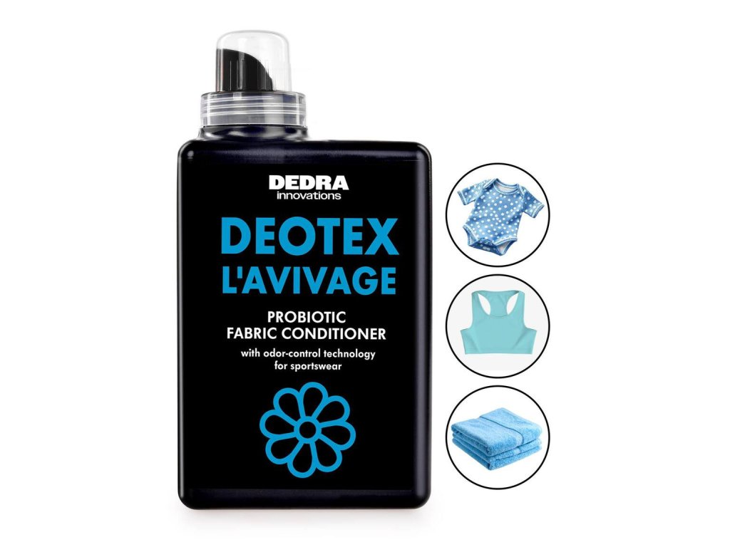 DEOTEX® L'AVIVAGE 1000 ml – inteligentný kondicionér s probiotikami do posledného plákania. Dávkujte do lievika práčky na aviváž. Odstraňuje pachy z vlákien, zanecháva jemnú vôňu a hebkosť. Ideálne aj pre športovú, funkčnú a detskú bielizeň. Šetrný ku všetkým typom textílií, bez klasických zmäkčovadiel.Dodatočné parametre