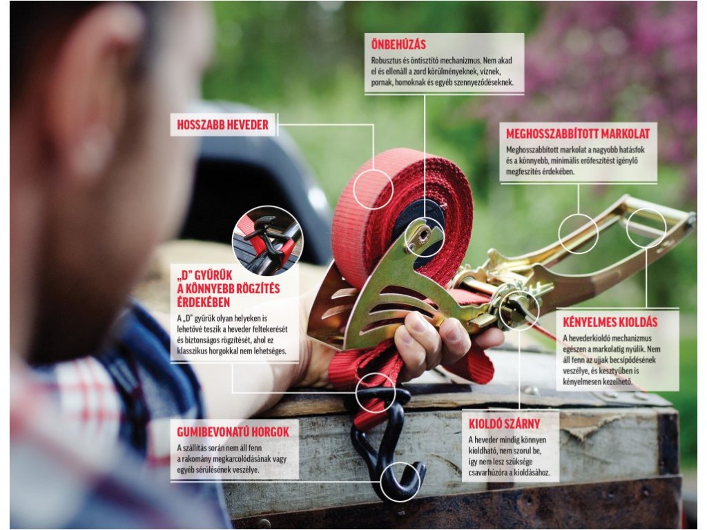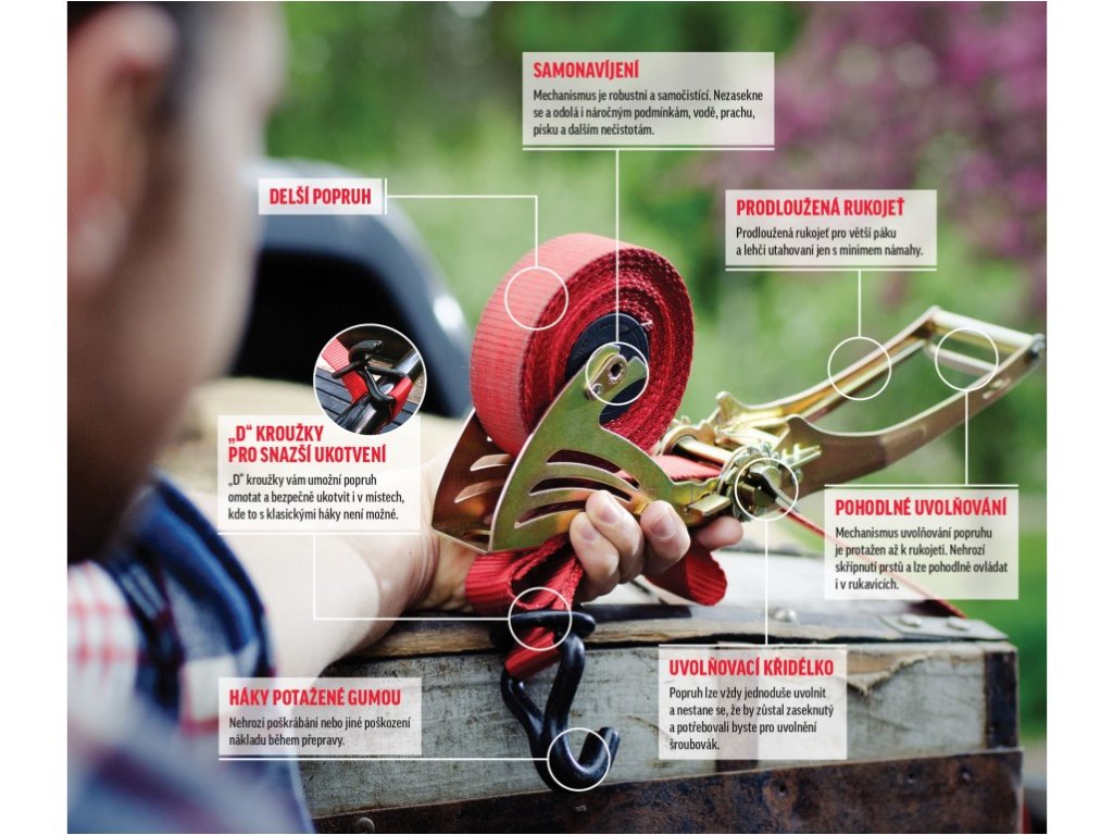 Zaisťovací systém QUICKLOADER® s nosnosťou až 1200 kg a dĺžkou 4,5 m (nastaviteľnou v rozmedzí 0,7 až 3,8 m) je spoľahlivým pomocníkom pri preprave ťažších bremien. Je navrhnutý pre každodenné použitie v náročnom prostredí - ideálny pre autodopravcov, remeselníkov aj náročnejších domácich. Integrovaný navíjací mechanizmus funguje plynule a bez zadrhávania – pás sa nezamotáva, je vždy pripravený na okamžité použitie a nezľakne sa ani prachu, vlhkosti či iných nečistôt. Predĺžená rukoväť umožňuje efektívne dotiahnutie s minimálnym úsilím. Jednoduché uvoľnenie zaisťuje praktické krídelko, ktoré funguje bez problémov aj v pracovných rukaviciach alebo v horších svetelných podmienkach. Robustné háky s gumovým poťahom pomáhajú ochrániť náklad pred poškodením, zatiaľ čo univerzálne „D“ krúžky rozširujú možnosti uchytenia – oceníte ich najmä tam, kde klasické háčiky nemožno použiť. Všetky kovové časti sú ošetrené opieskovaným povrchom, ktorý zvyšuje odolnosť voči opotrebovaniu aj korózii – zaručuje tak dlhú životnosť aj pri častom používaní.Dodatočné parametre