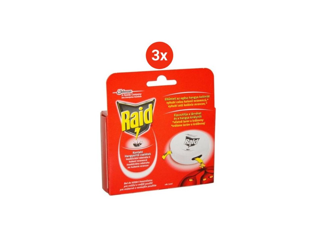 Insekticídna nástraha na ničenie mravcov Raid poskytuje veľmi účinnú ochranu v domoch, v bytoch či na vonkajších terasách. Pôsobí 24 hodín. Nástraha, ktorú prenášajú robotníci do hniezda, do 2 týždňov vyhubia celú kolóniu, vrátane lariev a kráľovnej. Návnada pôsobí po dobu niekoľkých týždňov. Pri rozsiahlejšom zamorení mravce použite na dosiahnutie účinku niekoľko nástrah súčasne.