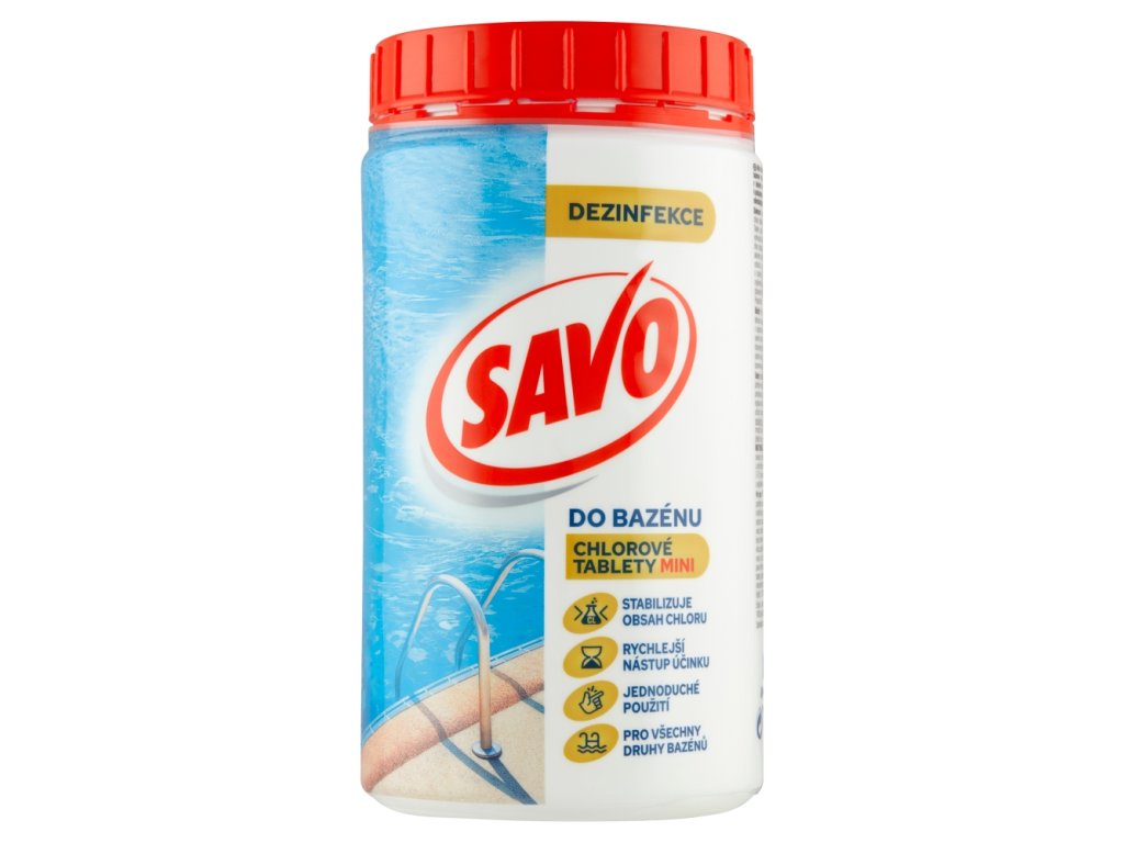 Bazénová chémia SAVO chlórové tablety pre celosezónnu dezinfekciu a údržbu bazénovej vody. Prípravok zabraňuje množeniu mikroorganizmov v bazénovej vode. Vďaka pozvoľnému rozpúšťaniu tablety dochádza k postupnému uvoľňovaniu účinnej látky (chlóru) a voda je tak neustále mikrobiologicky kontrolovaná.