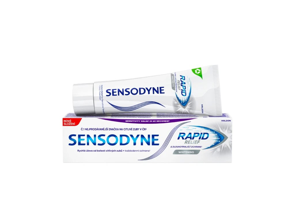 Sensodyne Rapid Whitening je zubná pasta určená na každodennú starostlivosť o citlivé zuby, ktorá kombinuje rýchlu úľavu od citlivosti s jemným bieliacim účinkom. Vďaka špeciálnemu zloženiu pomáha uzatvárať dentínové kanáliky a vytvára ochrannú vrstvu na citlivých miestach zubov, čím znižuje nepríjemné reakcie na studené, horúce alebo sladké podnety.