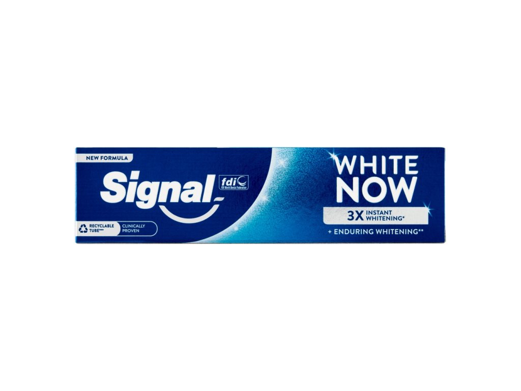 Unikátna zubná pasta s unikátnym bieliacim účinkom Signal White Now vám okamžite zaistí viditeľne belšie zuby – a to už po prvom vyčistení! Modrá pena pasty zanechá po vyčistení na zuboch jemný modrý film , ktorý v spojení s prirodzeným žltkastým odtieňom zubov vytvorí optický efekt bieleho úsmevu. Aktívne zložky majú zároveň postupný bieliaci účinok, a navyše, vďaka obsahu fluóru , pomáha pasta tiež chrániť zuby. Zbavte sa nechceného zažltnutého odtieňa vašich zubov s excelentnou bieliacou pastou Signal White Now!