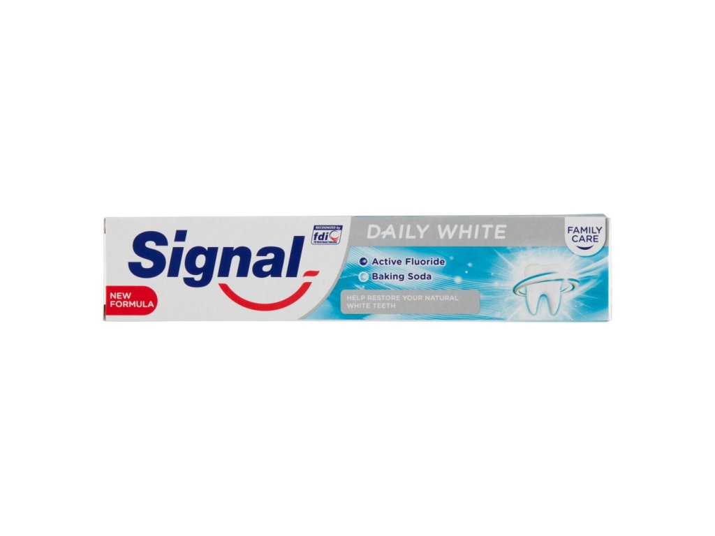 Účinné zloženie zubnej pasty Signal Daily White Family Care s obsahom bikarbonátu sodného citlivo pomáha znovu objaviť prírodnú belosť zubov vašej rodiny. Obsah fluoridu posilňuje sklovinu a zuby sú lepšie chránené proti vzniku zubného kazu. Pasta je špeciálne navrhnutá na každodenné použitie celou rodinou.