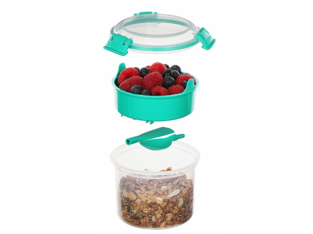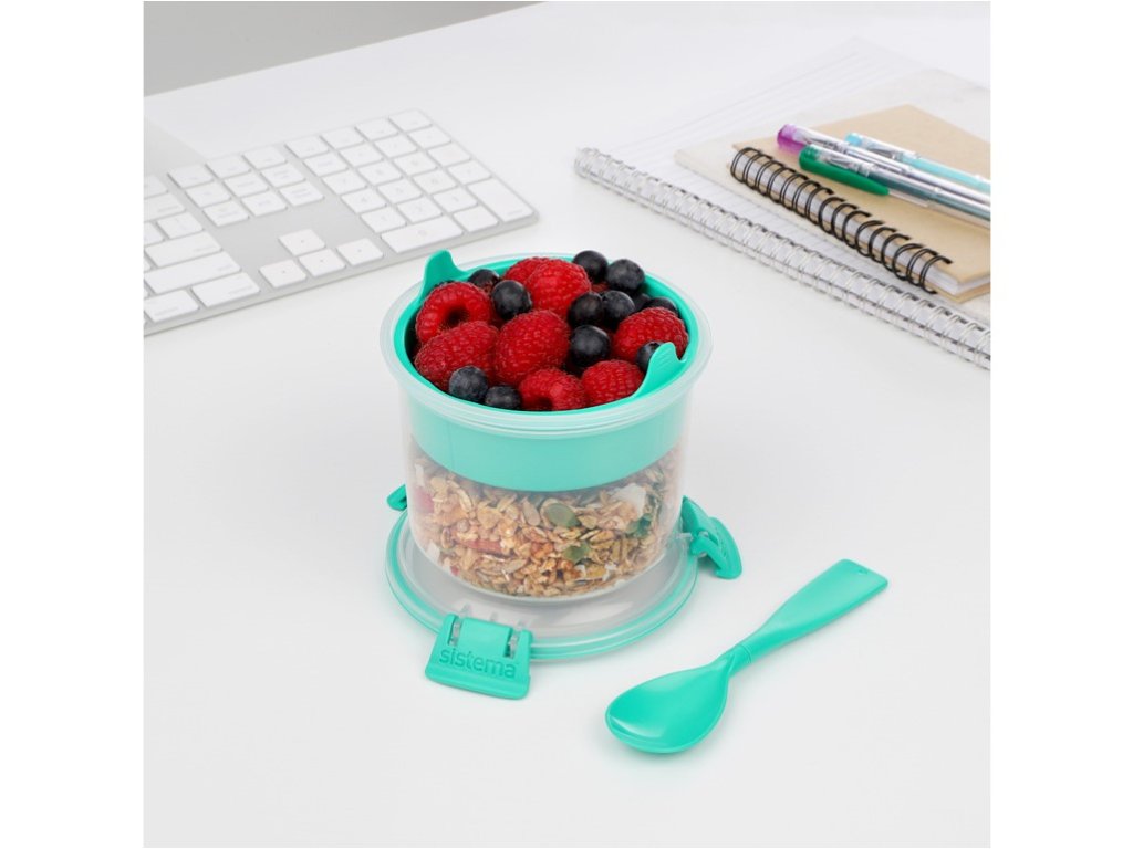 Sistema Dóza na raňajky s miskou a lyžičkou 530 ml je praktická dóza na raňajky, ktorá vám umožní vychutnať si výživné raňajky nielen na cestách. Vďaka oddeleným priehradkám a odnímateľnej tácke zostanú vaše cereálie chrumkavé a ostatné ingrediencie čerstvé až do doby konzumácie. Integrovaná lyžička zároveň eliminuje potrebu nosiť so sebou ďalší riad. Tento produkt nie je vodotesný. Výhody: Vhodné pre deti Oddelené priehradky na cereálie a ďalšie ingrediencie Odnímateľná tácka na udržanie potravín čerstvých Integrovaná lyžička Jednoduché uzamykanie: Klip Sistema® a pružné tesnenieDodatočné parametre