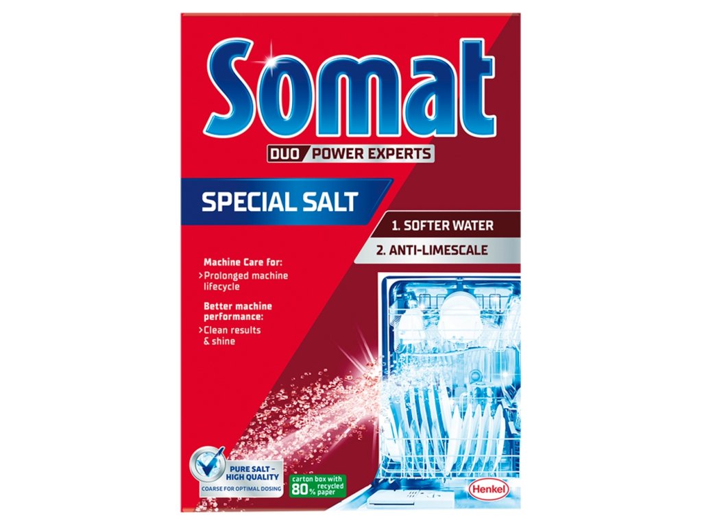 Soľ Somat s účinkom proti vodnému kameňu optimálne chráni umývačku riadu, ostrekovacie ramená a rúrky pred vodným kameňom. Produkt pomáha zaistiť dokonalú funkciu zariadenia na zmäkčovanie vody, ktoré mení kohútikovú vodu na vodu mäkkú. Vďaka tomu môže umývací prostriedok fungovať s maximálnou účinnosťou a zabraňuje sa škodlivému usadzovaniu vodného kameňa.