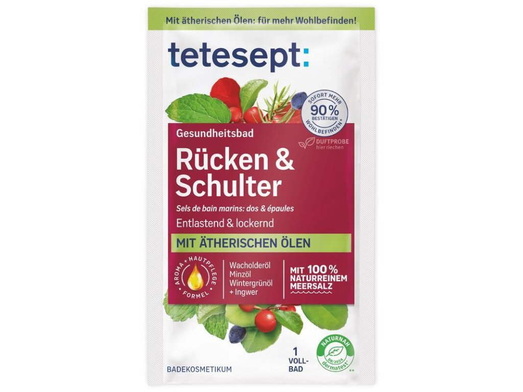 Morská soľ do kúpeľa Kúpeľová soľ tetesept Chrbát a ramená je špeciálna kúpeľová prísada z morskej soli na podporu zdravých svalov chrbta, ramien a krku. Unikátne zloženie kombinuje borievka, zimolez, zázvor a rozmarín. Táto vybraná kombinácia bola prispôsobená na uľahčenie problémom s chrbtom. Éterické oleje sa v spojení s teplou vodou rozvíjajú a navodzujú pocit relaxácie a efekt prehriatia chrbta, ramien a krku. Zažite tak pocit uvoľnenia napätia a zmiernenia bolesti. Okrem toho morská soľ tetesept udržuje pokožku zdravú prirodzeným spôsobom vďaka obsahu minerálov. Zriedkavá morská soľ „La Baleine“ od značky tetesept vzniká vo francúzskych saliniskách. V interakcii vody, slnka a vetra soľ prirodzene kryštalizuje s minerálmi a stopovými prvkami z morskej vody do formy bieleho zlata. Vyvinuté podľa najnovších vedeckých poznatkov. Kožná kompatibilita dermatologicky potvrdená. Bez konzervačných látok, parafínov, silikónov, minerálnych olejov. Vegánsky produkt. Použitie: nasypte morskú soľ tetesept do prúdu tečúcej vody o teplote 36-38 ° C a vychutnajte si 10-20 minút trvajúci kúpeľ. Po použití umyte vaňu horúcou vodou a odstráňte zvyšky produktu. Upozornenie: Nie je určené pre deti. Použite na zdravú pokožku. Uchovávajte mimo dosahu detí. Vyhnite sa kontaktu s citlivými časťami tela.Dodatočné parametre