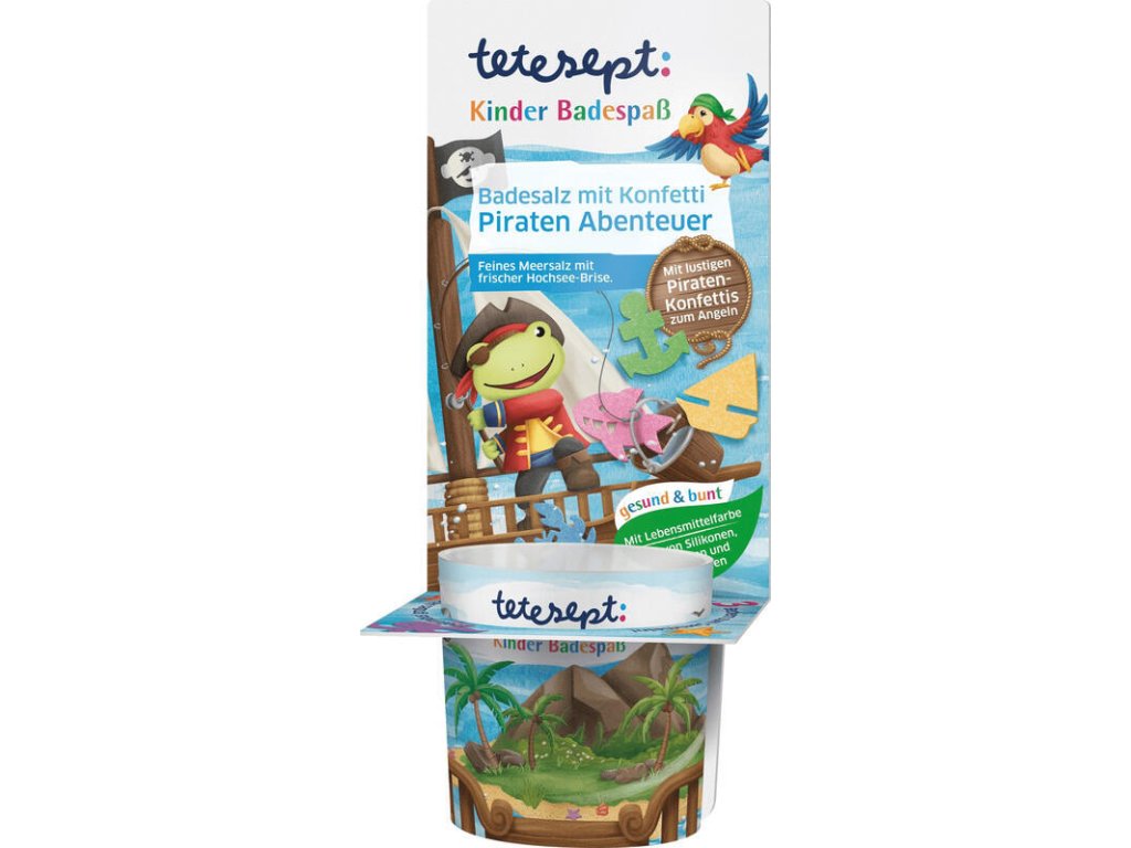 Svieža morská vôňa Kúpeľová soľ tetesept Pirátske dobrodružstvo obsahuje špeciálne upravenú receptúru pre citlivú pokožku dieťaťa, hlavnou ingredienciou sú jojobový olej a svieža morská vôňa. Bezpečné potravinárske farbivo vodu sfarbí do modra. Legrační konfetové postavičky vyplávajú na hladinu, vylovíte ich pomocou zberného téglika – s tromi zbernými téglikami je pirátske dobrodružstvo kompletné. Dermatologicky testované Mierne čistí a vyživuje S potravinovým farbivom Kúpeľová voda nesfarbí pokožku, vlasy, ani vaňu Pre deti od 3 rokov Použitie: Odstráňte priehľadnú fóliu z téglika a opatrne nasypte kúpeľovú soľ s konfetami do tečúcej vody. Konfety sa skladajú z neškodného kukuričného škrobu a začínajú sa rozpúšťať už po 10 minútach. Užite si 10 až 20 minút trvajúci kúpeľ pri teplote 35 až 38 ° C podľa potreby. Po kúpeli odstráňte zvyšky konfiet a vaňu opláchnite horúcou vodou, aby sa odstránili zvyšky produktu. Upozornenie: Nepoužívajte kúpeľový produkt nezriedený. Nie je vhodný na konzumáciu. Uchovávajte mimo dosahu detí. Zabráňte priamemu kontaktu s citlivými povrchmi a predmetmi.Dodatočné parametre