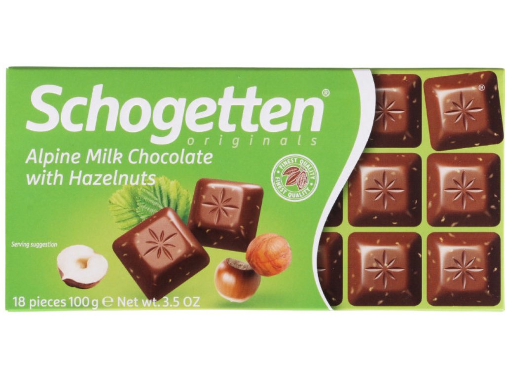 Alpská mliečna čokoláda s kúskami lieskových orieškov.