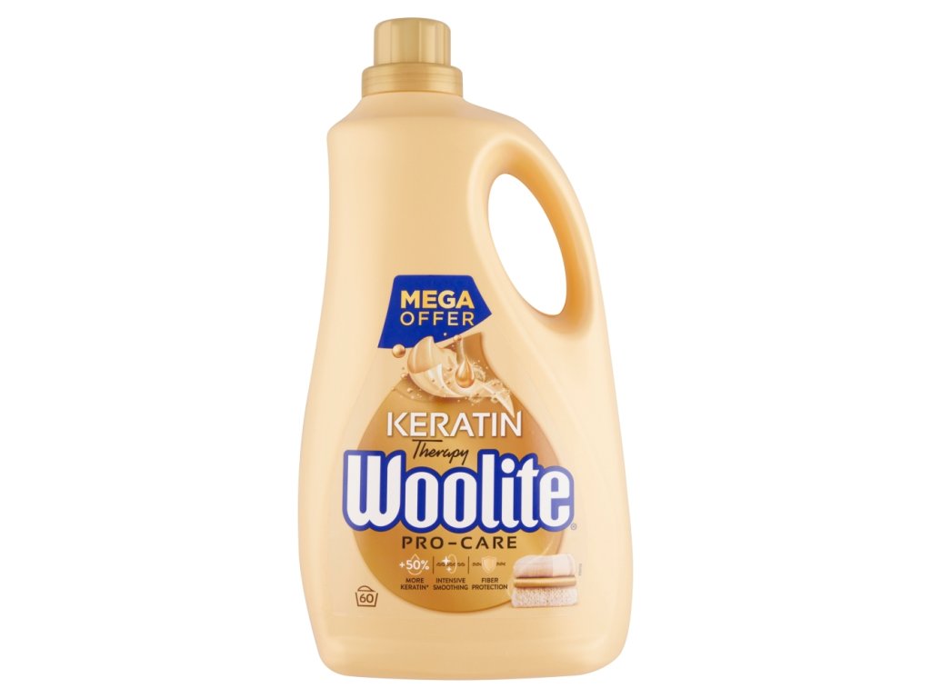 Tekutý prací prostriedok Woolite Pro-Care obsahuje keratín, ktorý chráni, ošetruje, zjemňuje a hydratuje vlákna bielizne, zároveň pôsobí nekrčivým efektom a dodáva vláknam bielizne flexibilitu.